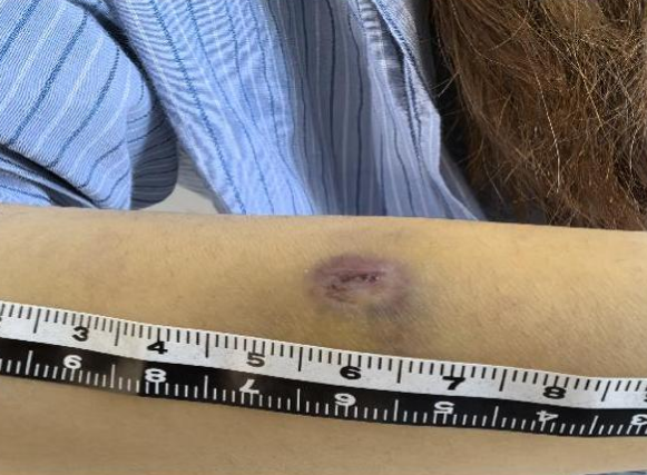 5月23日傍晚,与朋友逛街的小丽在路边等红灯时,手臂突然被什么东西狠狠“砸”了一下,疼得她叫出了声。低头一看,手臂上已经出现一个圆形伤口,不停流血。
